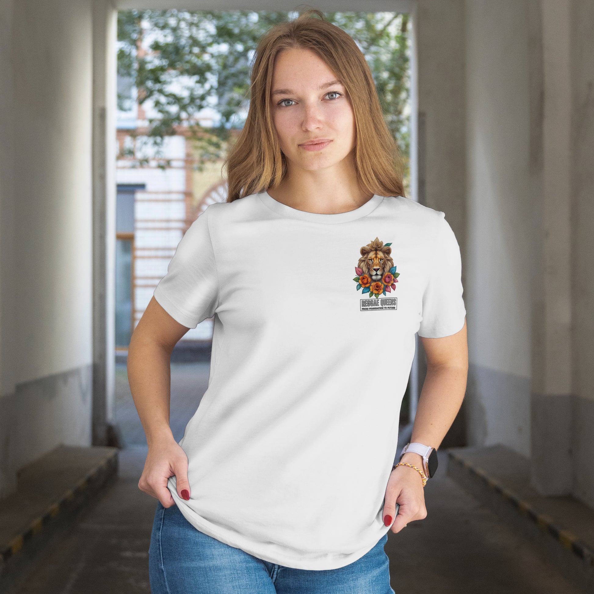 Stand bold in this reggae T-shirt featuring a lion crest surrounded by bright blooms and a subtle chest hit up front. Soft ringspun cotton, classic unisex fit, and double-sided artwork that turns heads from festival gates to everyday rotation.