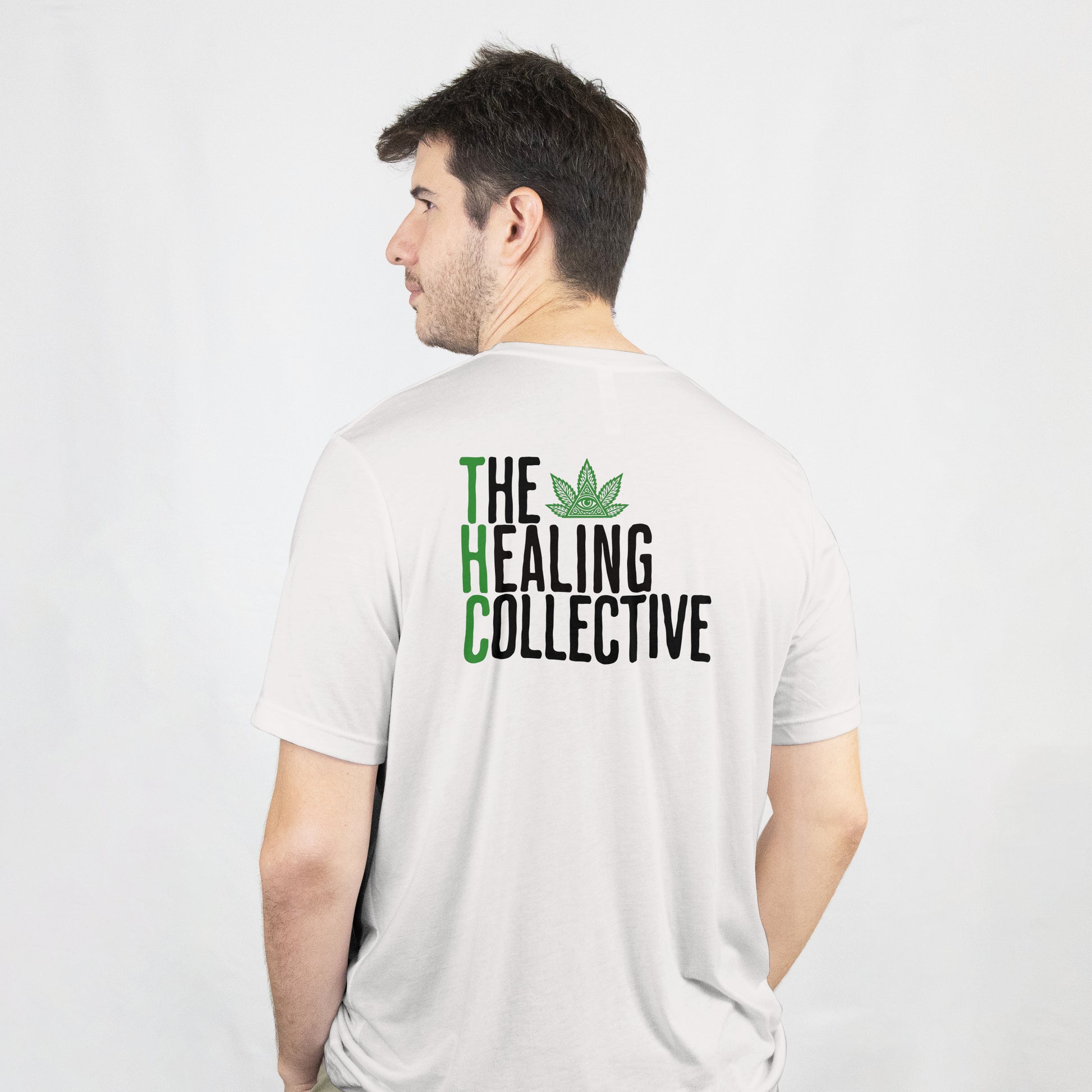 Printed in-house using eco-friendly inks. Back graphic reads “The Healing Collective” with green THC lettering; front features the sacred-eye cannabis emblem.